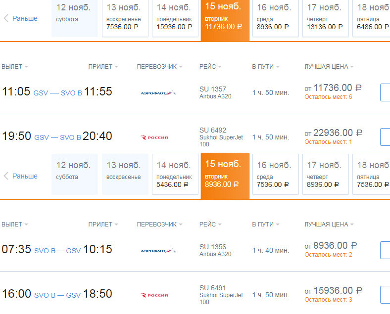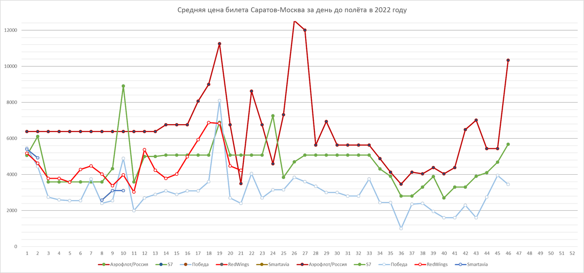 Седьмой год каждую неделю я анализирую цены на один и тот же вариант вылета. Для этого я выбрал нейтральный день - вторник. Не начало и не конец недели, когда спрос выше (пт, сб, вс и пн). Я смотрю цены на этот день при покупке билетов более чем за сутки (вечер с вс на пн). Весьма показательный способ сравнивать цены на срочную покупку билетов (за сутки-двое). Когда билеты берут за несколько месяцев, планируя отпуск раз-два в год - это не самый наглядный вариант сравнивать цены, т.к. заранее продаётся меньшинство билетов - те самые 2-10 билетов на рейс по самым низким ценам.